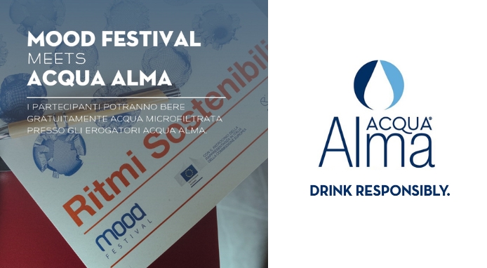 Acqua Alma, brand dedicato all’acqua di rete trattata (bene), sarà partner d’eccezione di questo imperdibile evento. Durante il Mood Festival, infatti, sarà possibile usufruire e bere gratuitamente acqua spillata al momento ed effettuare il refill grazie ai tre impianti Acqua Alma, utilizzando bicchieri e cannucce biodegradabili.