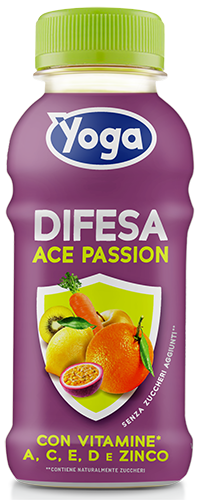 Una bottiglietta di Yoga Difesa ACE Passion contiene infatti il 50% del valore nutritivo di riferimento (VNR) di vitamine A, C, D, il 50% di Zinco e il 30% di vitamina E.