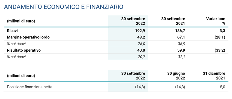 La posizione finanziaria netta al 30 settembre 2022 è negativa per 14,8 milioni di euro, già al netto della distribuzione di dividendi per 30 milioni di euro effettuata nel secondo trimestre. Nei primi nove mesi, la generazione di cassa** al lordo dei dividendi è positiva per 7,6 milioni di euro, nonostante la crescita di 15,3 milioni di euro del capitale circolante.