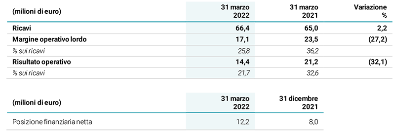 La posizione finanziaria netta al 31 marzo 2022 è positiva per 12,2 milioni di euro, con una generazione di cassa1 positiva nel trimestre per 4,6 milioni di euro nonostante la crescita di 12,0 milioni di euro del capitale circolante, legata al già citato incremento del costo della materia prima.
