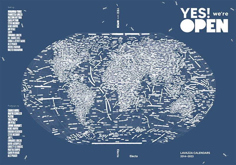 L’appuntamento presso la Triennale di Milano è anche l’occasione per presentare al pubblico il volume YES! we’re OPEN, a cura di Fabio Novembre. Lavazza ha deciso di celebrare così dieci anni di vocazione per la sostenibilità ambientale e sociale del proprio Calendario, realizzando un ideale viaggio attorno al mondo per accompagnare il lettore ad approfondire i valori che hanno guidato l’Azienda e scoprire il lavoro che ha plasmato un decennio di intensa attività creativa e di azioni concrete per il cambiamento.