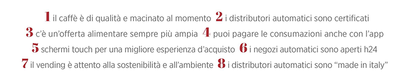 Il racconto per immagini illustra 8 temi che verranno lanciati sui social a cadenza settimanale. Il primo è dedicato al caffè che nei distributori automatici nell’85% dei casi ormai è in grani e macinato al momento, fornito dai più importanti brand italiani o da piccole e medie torrefazioni di qualità.