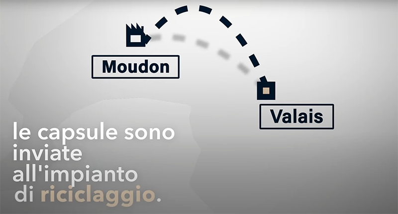 Il consumatore raccoglie le capsule esauste nel sacchetto col bordo giallo. Il postino ritira il sacchetto all’atto di inserire la posta nella buca delle lettere. Le capsule di alluminio vengono inviate all’impianto di riciclaggio di Valais. Qui l’alluminio viene separato dai fondi di caffè grazie ad una tramoggia. I fondi di caffè vengono raccolti in cassonetti da 40 m³. Una parte viene inviata a un impianto di biogas ed un’altra a un impianto di compostaggio. L’alluminio viene separato da eventuali parti di plastica e posto su pallet. L’alluminio viene inviato in fonderia e poi spedito ad aziende che producono oggetti utilizzando alluminio riciclato, risparmiando il 95% di energia. Nespresso Svizzera collabora con Caran d’Ache che utilizza l’alluminio per realizzare portamine e i fondi di caffè per le mine, mescolandolo ad altri materiali. Parte dei fondi di caffè viene inviata all’impianto di compostaggio di Lavaux. Il compost viene utilizzato da aziende vitivinicole per fertilizzare il terreno e ottenere un’uva più sana e naturale, da cui si produce vino.