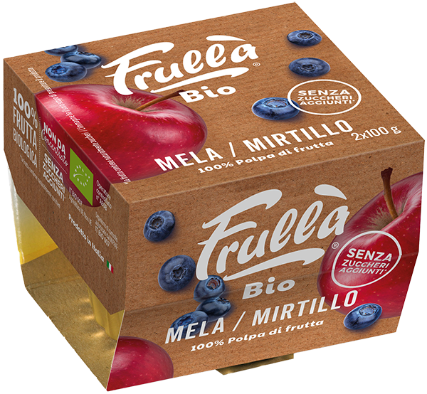 Frullà Bio è il marchio di Natura Nuova che identifica i frullati ottenuti rigorosamente da frutta biologica fresca, mai da concentrato. Fa parte di questa linea il “bi-gusto” mela e mirtillo, nella classica vaschetta in alluminio, completamente riciclabile.