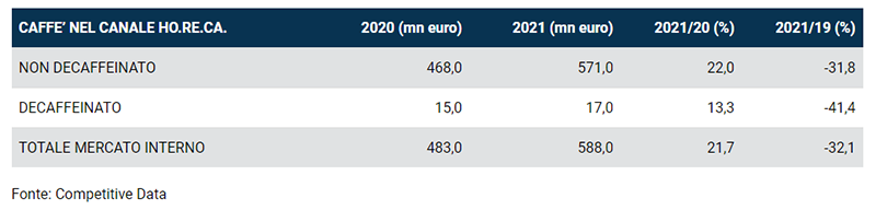 Nel 2021 le vendite di caffè torrefatto nel canale Ho.Re.Ca. hanno fatto registrare un parziale rimbalzo a valore del +21,7%, per attestarsi su un controvalore di 588,0 milioni di euro, ancora distante dai livelli pre-covid (866,0 milioni di euro).