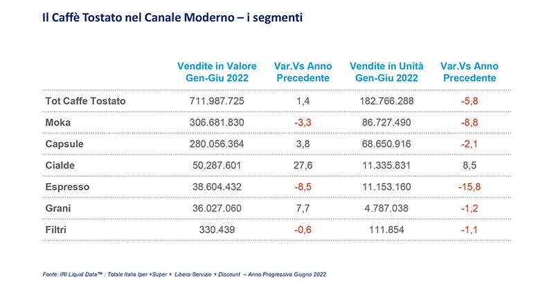 L’analisi del mercato del Caffè Tostato, pubblicata da IRI, mostra che il primo semestre del 2022 segna un cambio di scenario importante rispetto alle performance realizzate negli anni precedenti e, in particolare, rispetto al 2021 quando ha sviluppato un giro d’affari di oltre 1,3 miliardi di euro con una crescita dell’1,1% trainata dai segmenti Cialde, Capsule e Grani.