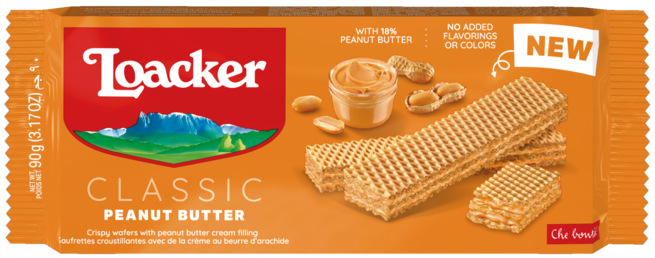 Loacker Classic Peanut Butter rappresenta il goloso connubio tra tre fragranti cialde arricchite da un pizzico di cacao e due strati di golosa crema (che costituisce il 75% del prodotto) preparata con pura pasta di arachidi (che compone il 17% della crema). Ideali per rendere speciali le pause durante la giornata, i Loacker Classic Peanut Butter sono disponibili nella monoporzione da 45g, oltre che in quelle da 90g e 175g.