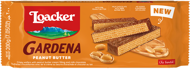 Loacker Gardena Peanut Butter sono fragranti cialde di wafer, farcite con una ricca e gustosa crema di arachidi e ricoperte da un irresistibile strato di cioccolato al latte. I nuovi Loacker Gardena Peanut Butter sono disponibili nella monoporzione da 12,5g, e nelle confezioni da 38g e da 200g.