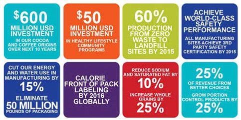 Per ciò che concerne la produzione di snack, Mondelez ha dichiarato di voler ridurre del 10% la quantità di sodio e di grassi saturi entro il 2020 e, contemporaneamente aumentare del 25% la quantità di cereali integrali. Altro obiettivo per il 2020 è quello di incrementare il numero di prodotti confezionati singolarmente in porzioni che non superino le 200 calorie.