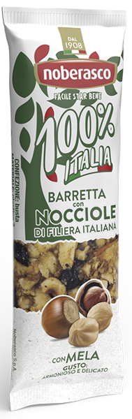 Noberasco propone la nuovissima e croccantissima barretta con nocciole e mele coltivate e raccolte all’insegna del tricolore come ne ricorda la confezione, perché di filiera 100% Italia!