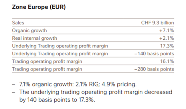 La Zona Europa ha registrato un’elevata crescita organica a una cifra (7,1%), che riflette l’aumento dei prezzi, un’ulteriore ripresa dei canali fuori casa e l’innovazione.