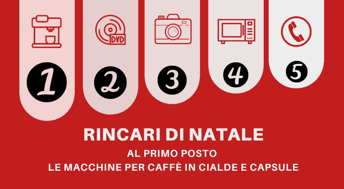 Per la top 30 dei regali, al 1° posto le Macchine da caffè in cialde o capsule che rispetto a un anno fa costano il 25,9% in più. Al 2° posto i film in dvd che salgono del 23,6%. Medaglia di bronzo per macchine fotocamere e videocamere che aumentano del 20,2%.