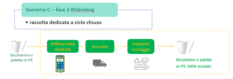 Partecipare al progetto RiVending ha un impatto ambientale significativo per una gestione vending. Infatti, le aziende che istallano a fianco dei propri distributori automatici i cestini dedicati alla raccolta dei bicchieri e palette in plastica (PS), secondo lo studio di eAmbiente, risparmiano in media circa 100 kg di CO² all’anno a cestino.