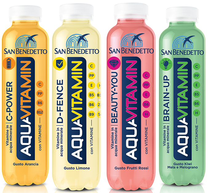 San Benedetto Aquavitamin è la linea di bevande analcoliche vitaminiche, con un alto contenuto di vitamina C e altre vitamine, in grado di fornire il 20% del fabbisogno quotidiano al nostro organismo. Il prodotto è dedicato a tutti coloro che svolgono una vita attiva, attenti al proprio benessere e con uno stile di vita giovanile e dinamico.