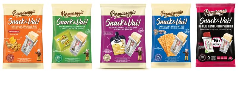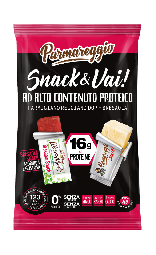 Parmareggio aggiunge una nuova referenza alla linea Snack& Vai!: lo Snack&Vai ad alto contenuto proteico che si compone di uno Snack di Parmigiano Reggiano da 17g, 100% naturale, che unisce bontà e naturalità ad un’elevata digeribilità e valore nutritivo, e di una barretta di bresaola da 25g, che racchiude tutto il gusto della tradizione in un morbido, innovativo e pratico formato.